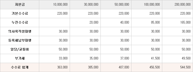 이외에 법인인감도장, 인지대, 법인인감증명서, 법인등기부 발급비용 등은 실비로 추가됩니다.